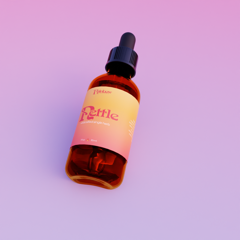 Product renders for "Nettle Wildcrafted Single Herb Tincture" in an Amber Dropper Bottle.